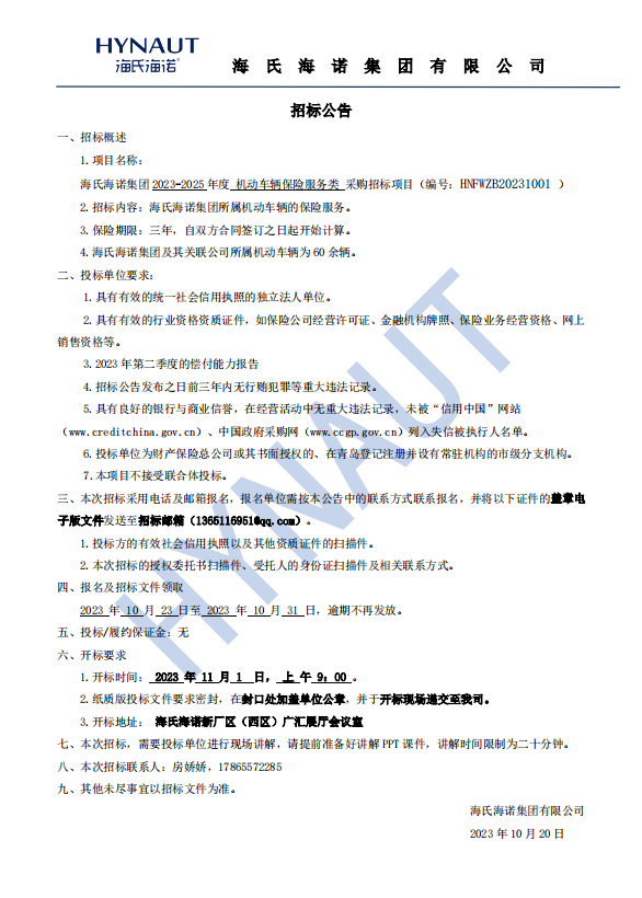《海氏海諾集團(tuán)2023-2025年度機(jī)動(dòng)車輛保險(xiǎn)服務(wù)類采購(gòu)招標(biāo)公告》