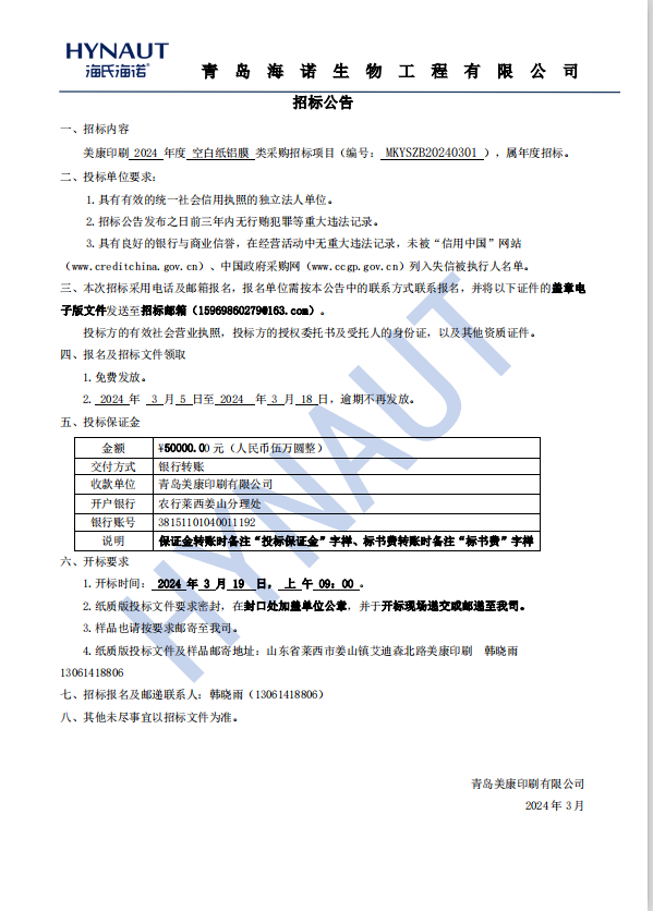2024年度美康印刷空白紙鋁膜采購招標(biāo)項(xiàng)目招標(biāo)公告